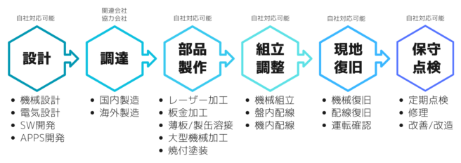 我々は自社内に設計から保守点検までのモノづくりに必要な各セクションや技術を持っております。