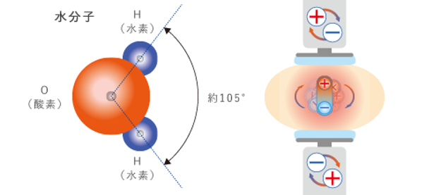 水は酸素原子1個と水素原子2個の共有結合でできておりますが、水素分子が約105度で結合しているために永久極性分子となっており、水分子単体でも電位差があります。