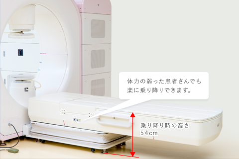 アスクーフ8は患者さんと医療に携わる皆さんの負担を軽減する配慮から、患者さんの乗り降りの際のベッドの高さを低くしております。また、横方向治療時のベッドの嵩上げ作業が不要です。