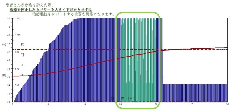 20秒毎に数秒間の出力低下を挟む事で、治療を中止する事なく患者さんの治療時の痛みを伴う不快感をコントロールし、温熱療法を継続させる事が出来ます。