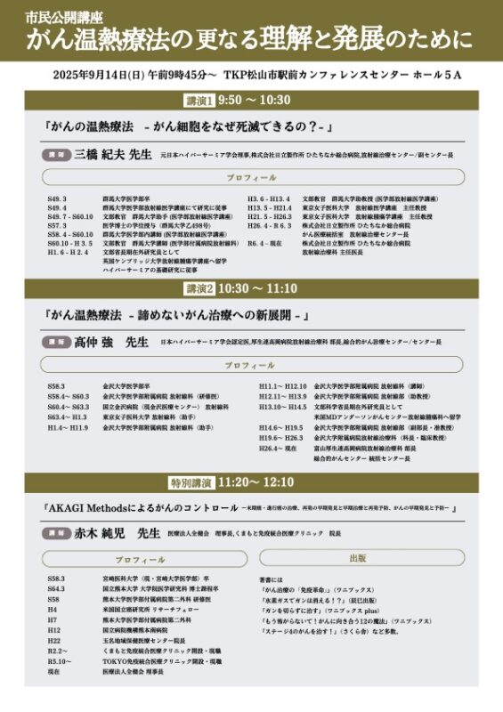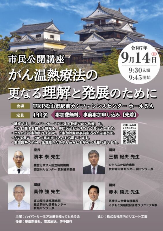 2025年9月14日(日)、松山市のTKP松山市駅前カンファレンスセンターにてハイパーサーミアによる最新のがん治療をテーマにした松山市民公開講座を開催いたします。