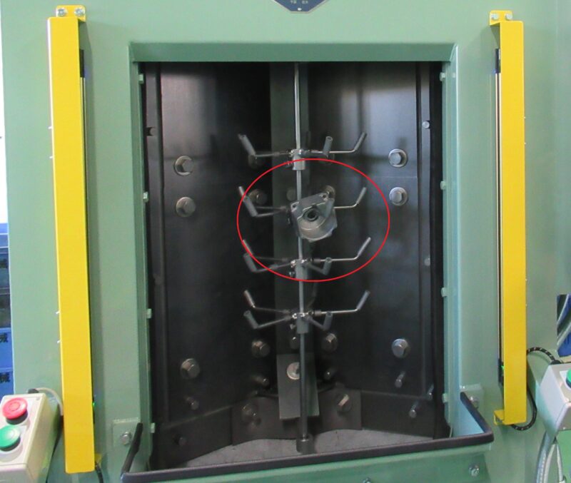 令和六年十一月に新たにフッキング式の研掃機が導入されました。研掃機は塗装を付きやすくする為の前処理工程で、アルミダイカスト加工素材の汚れを取ってきれいにします。フッキング式の研掃機は一度に多くの数を仕上げることは出来ませんが、素材同士がぶつかり合ってのキズやバリ等は発生しない為、これまでのバレル式で行っていた研掃後の修正作業時間がなくなります。素材が大きいものはフッキング式へ、小さいものはバレル式にと種類分けをして立ち上げ作業を行い、本格的に生産を進めています。