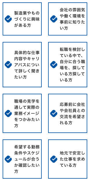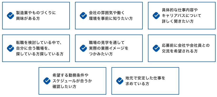 工場によって環境(気温・広さ等)も異なりますので、実際に見て体感していただくことで、入社後のイメージが湧きやすくなります。