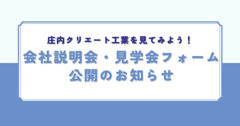 このたび、庄内クリエート工業では、会社説明会・工場見学会の応募フォームを公開いたしました。
